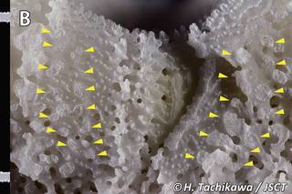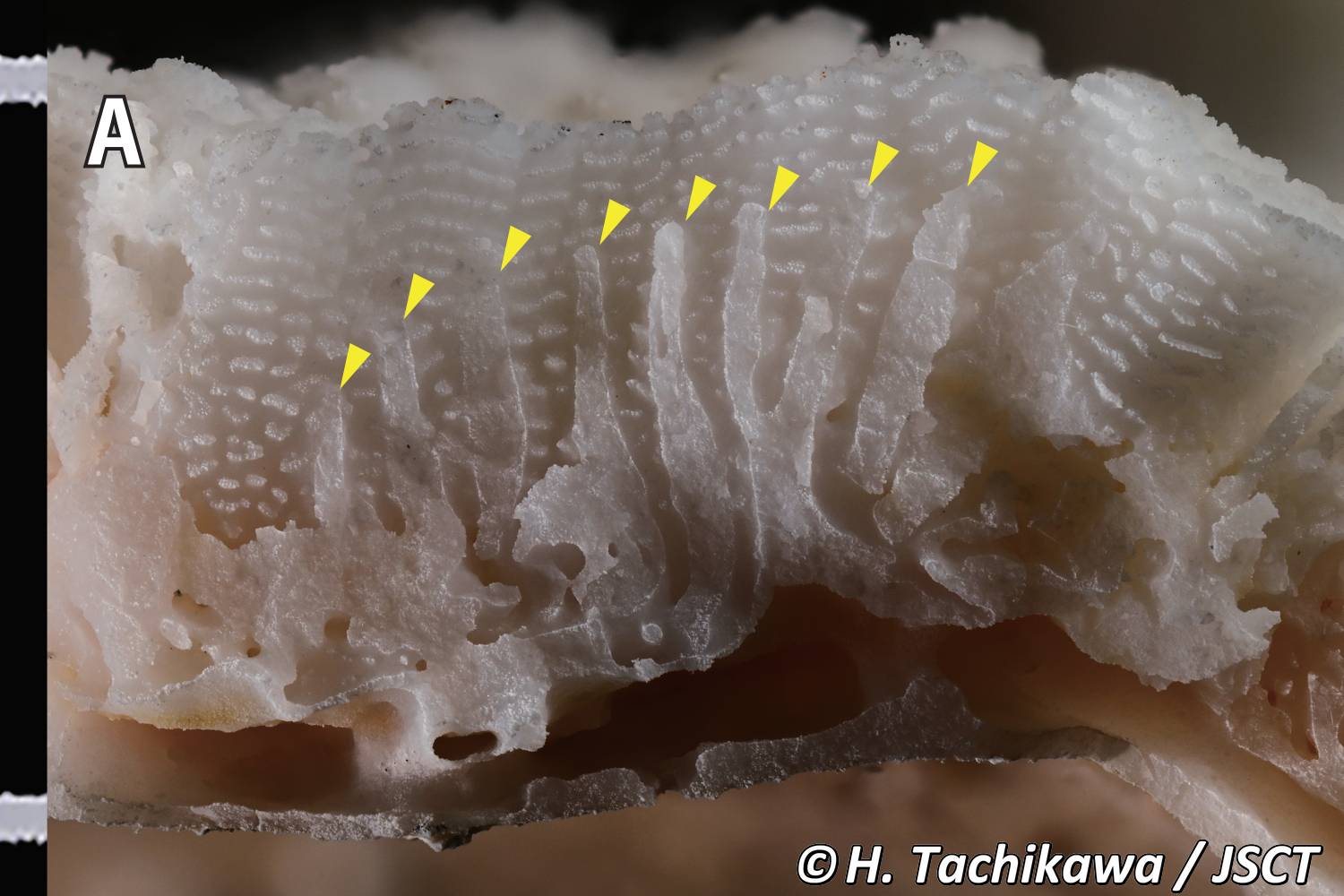 図1. サンゴ体破断面に見る複合シナプティキュラ (A) と単純シナプティキュラ (B)。黄色矢印は各シナプティキュラの断面を示す。A: Cycloseris wellsi ウェルズヤスリサンゴ (クサビライシ科) の複合シナプティキュラ。個々の複合シナプティキュラはサンゴ体壁 (下方) から隔壁縁辺 (上方)