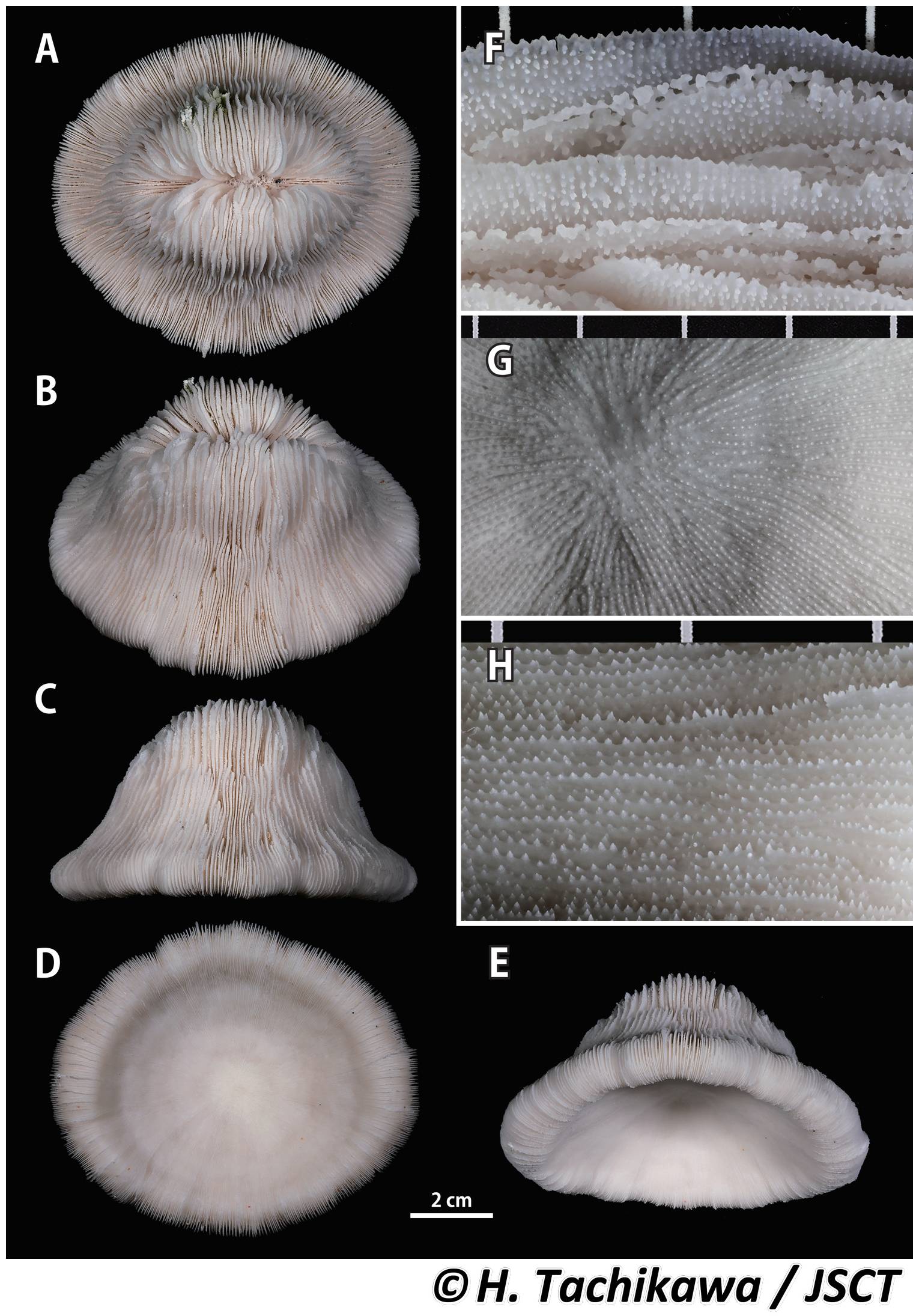 図3A–G. CMNH-ZG 08619. 奄美諸島加計呂麻島, 水深 22 m. 2017-10-06. サンゴ体の長径 66.3 mm.