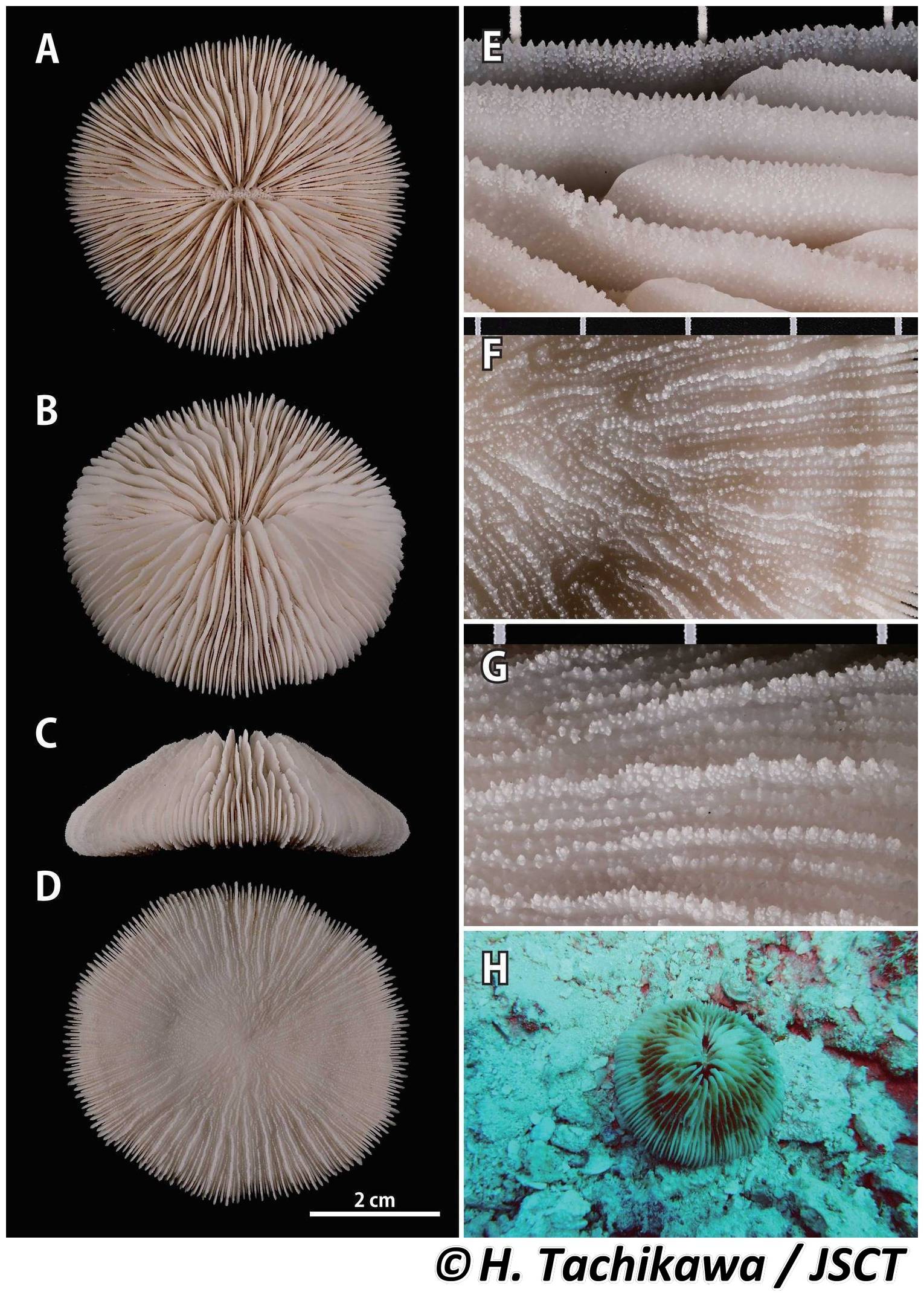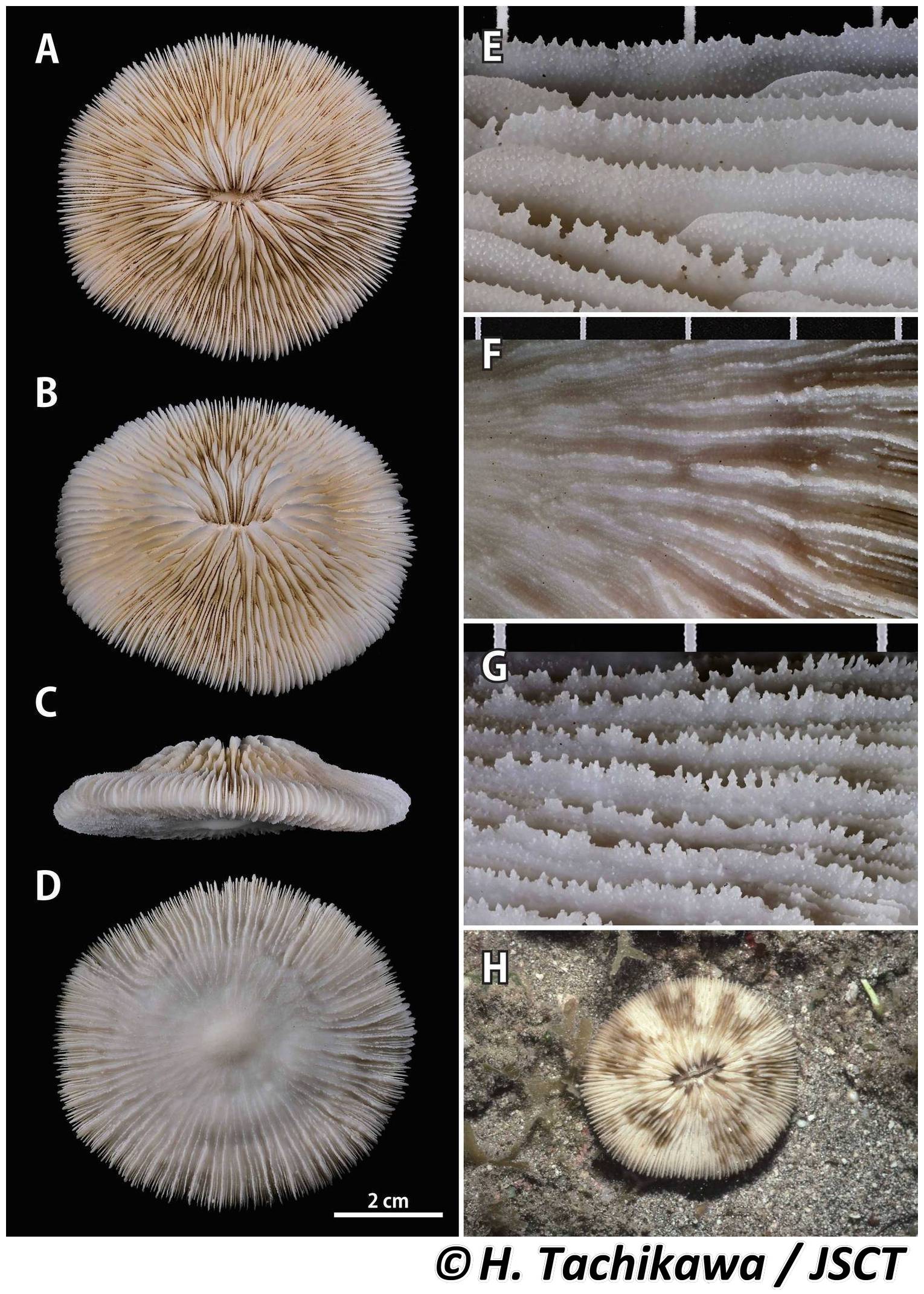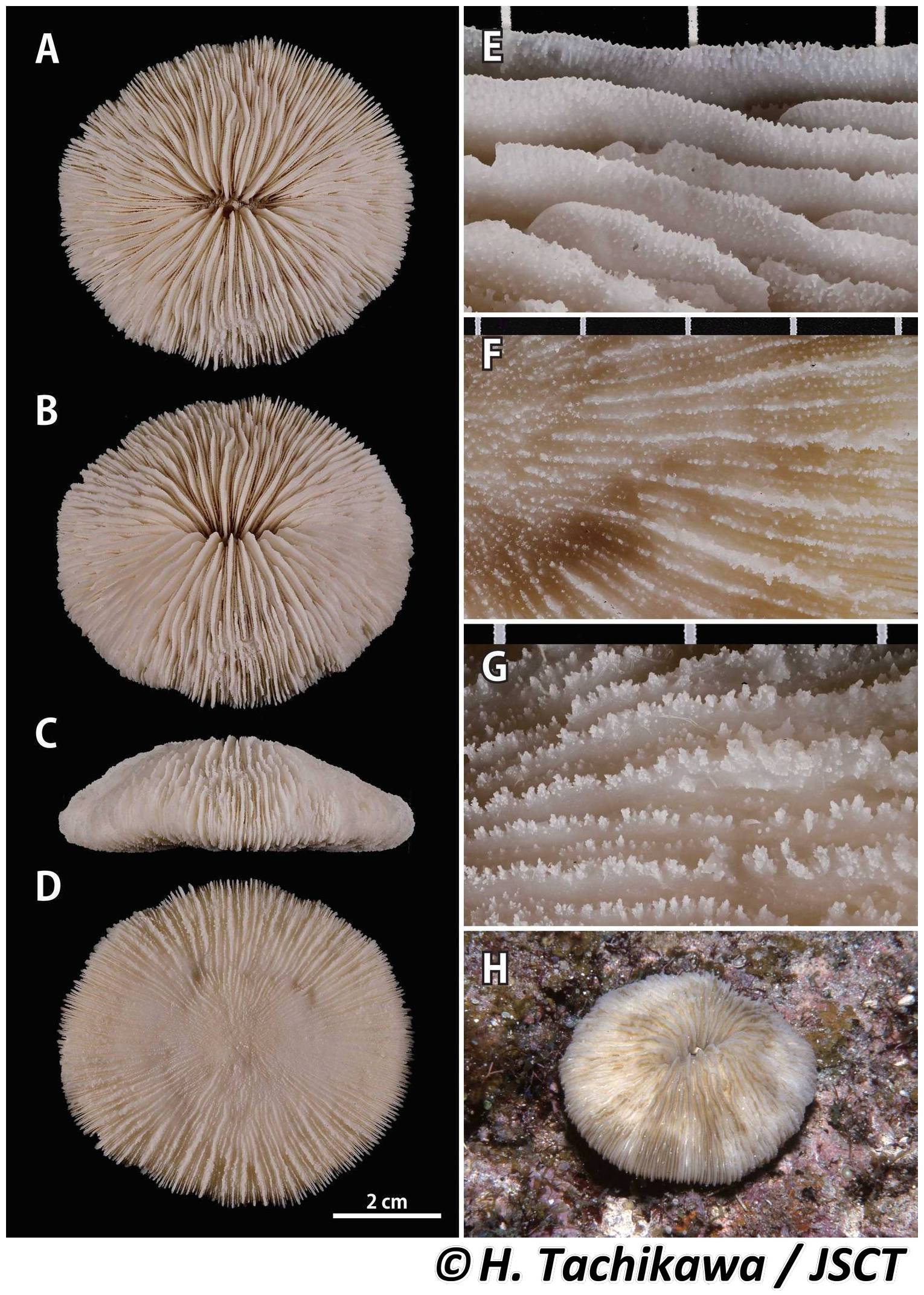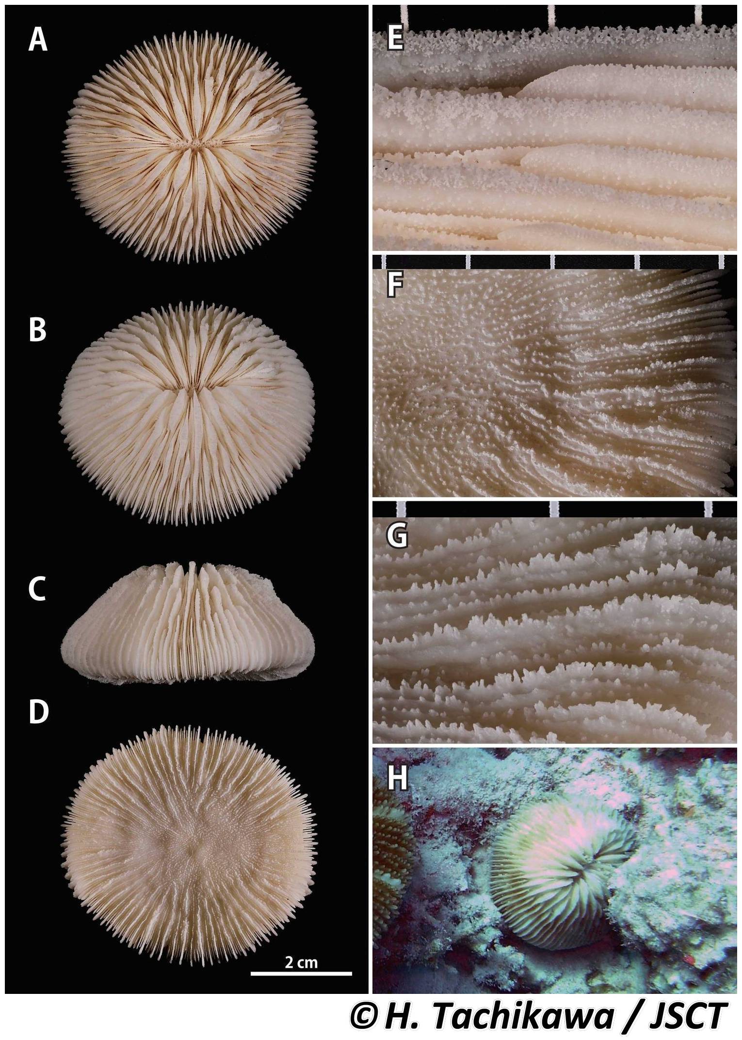 図3A–H. CMNH-ZG 06970. 宮古諸島八重干瀬, 水深 20 m. 2014-10-25. サンゴ体の長径 53.8 mm.