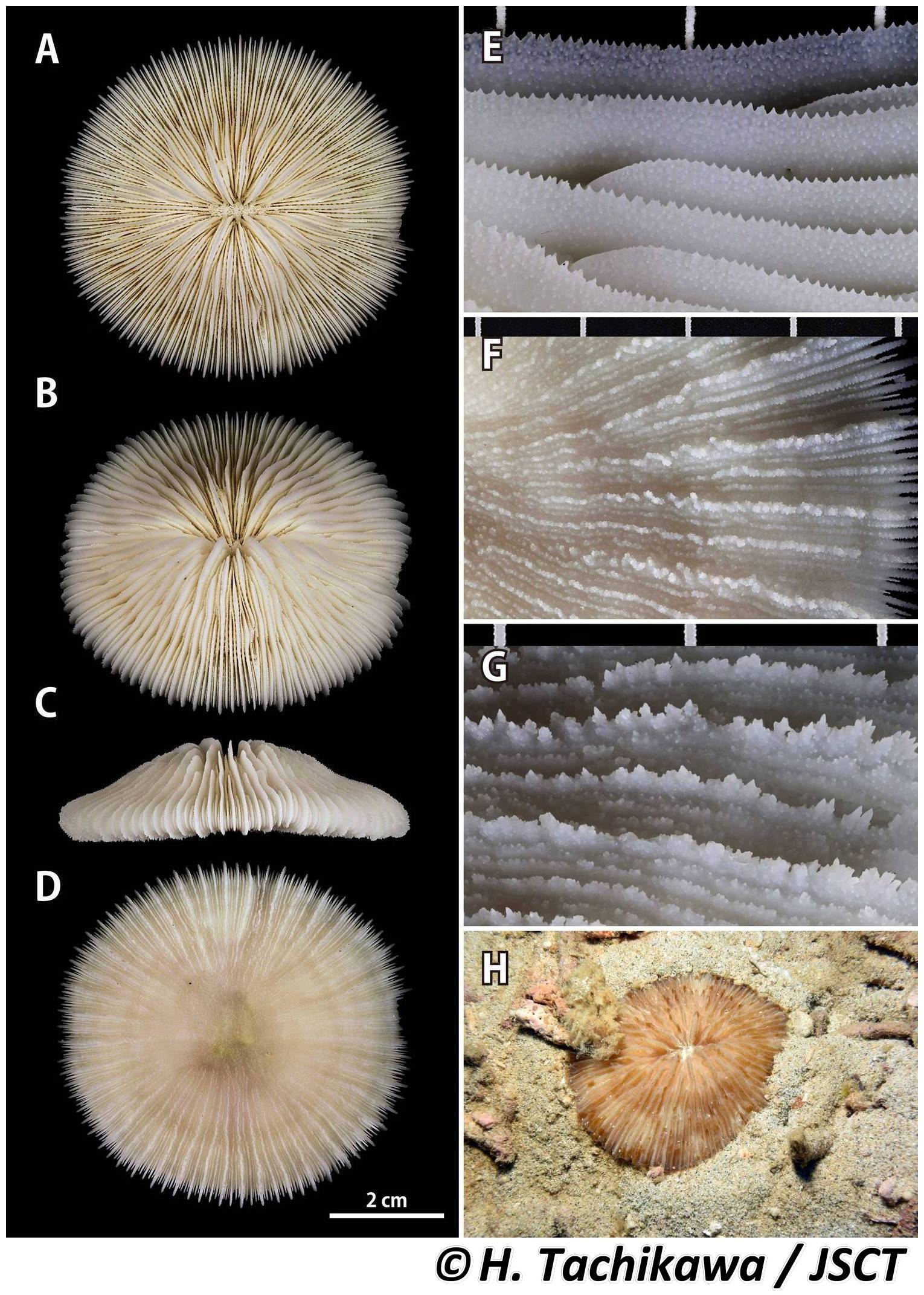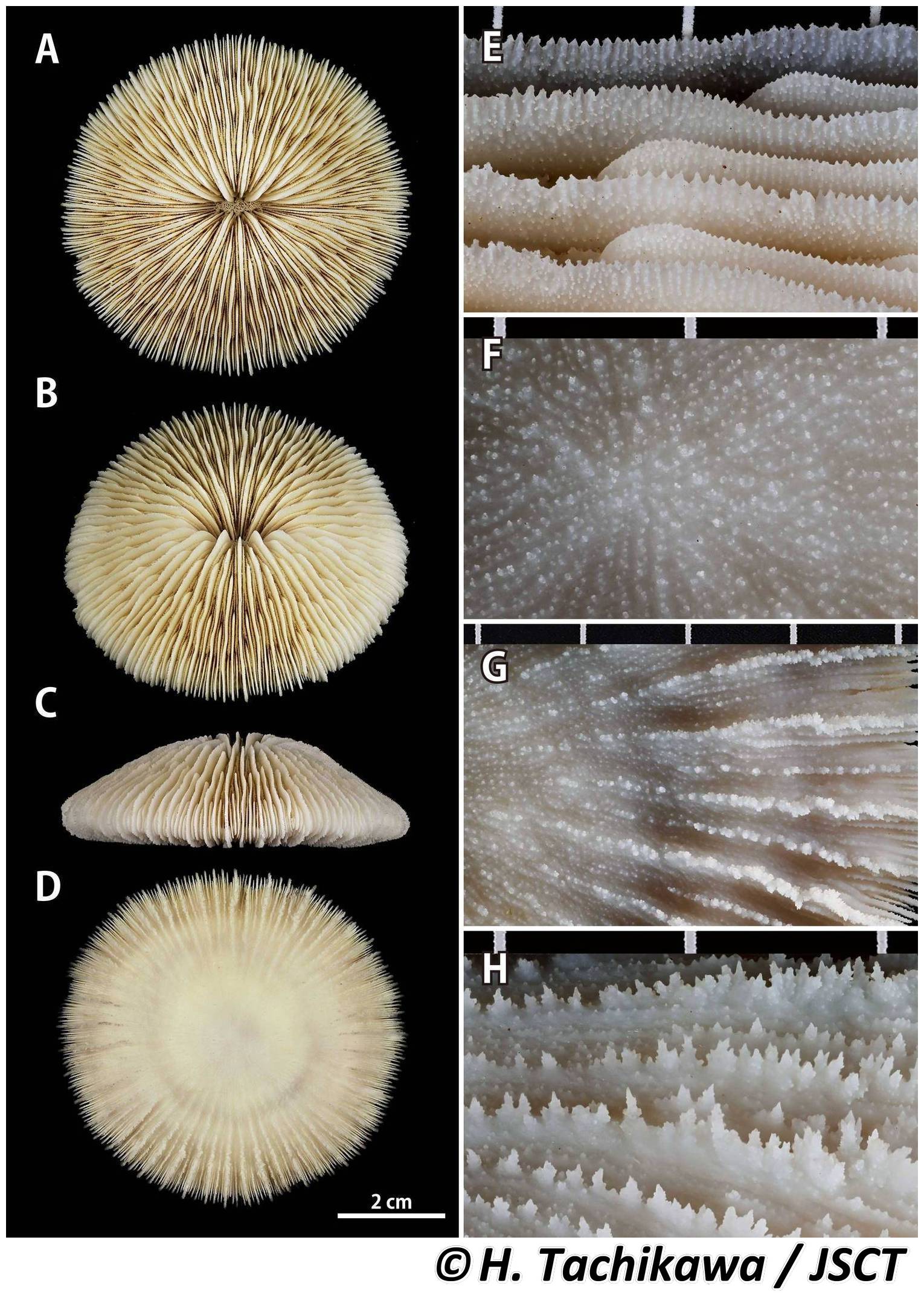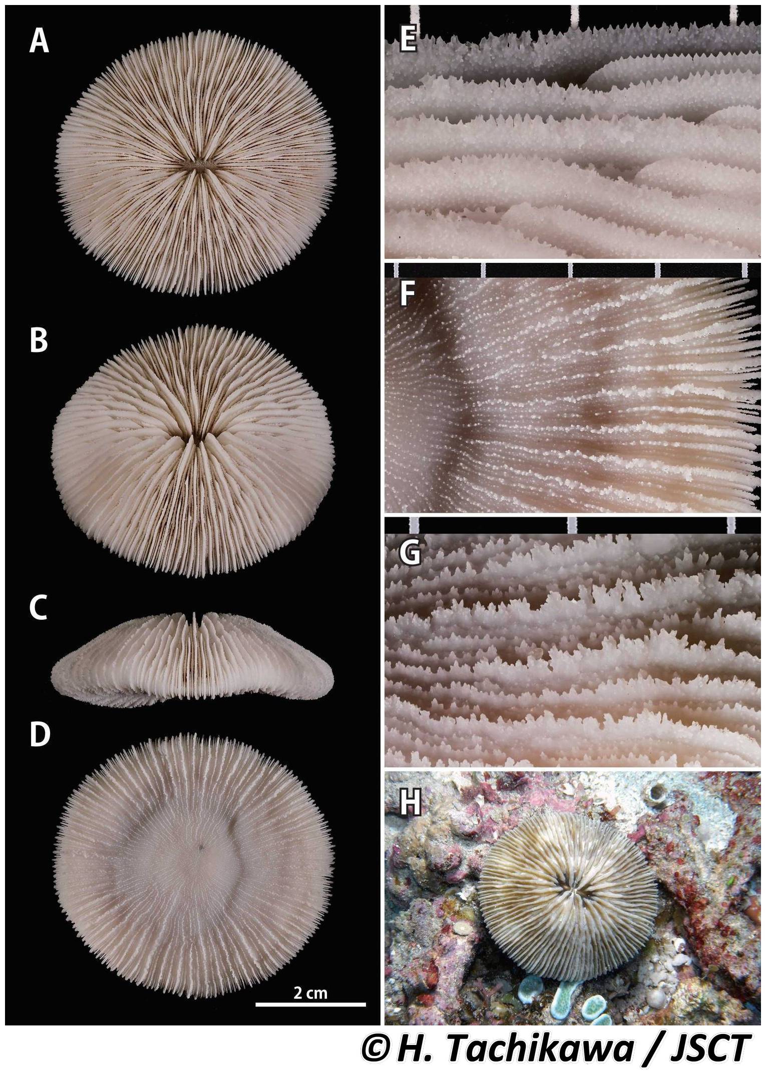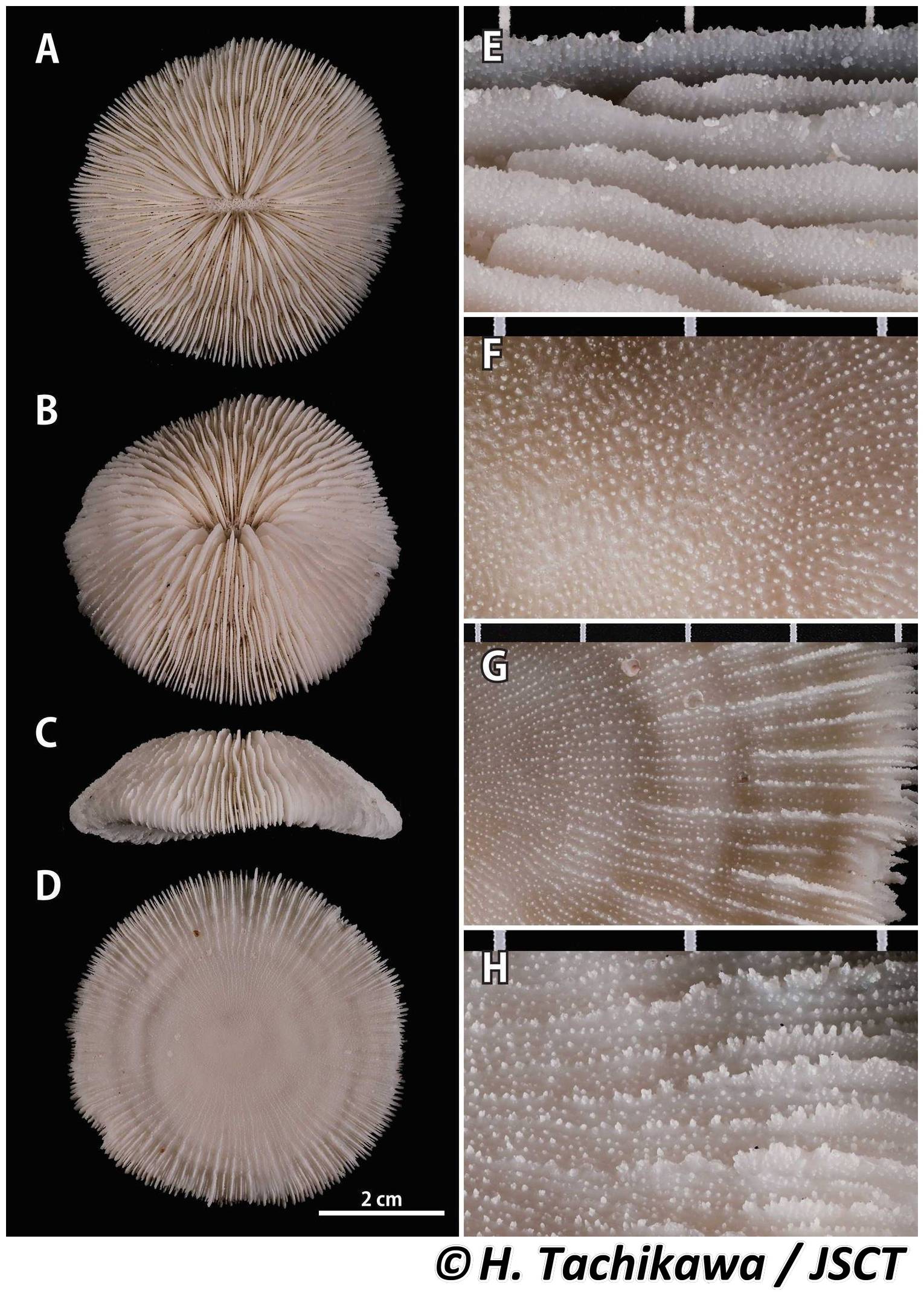 図3A–H. CMNH-ZG 06970. 宮古諸島八重干瀬, 水深 20 m. 2014-10-25. サンゴ体の長径 53.8 mm.
